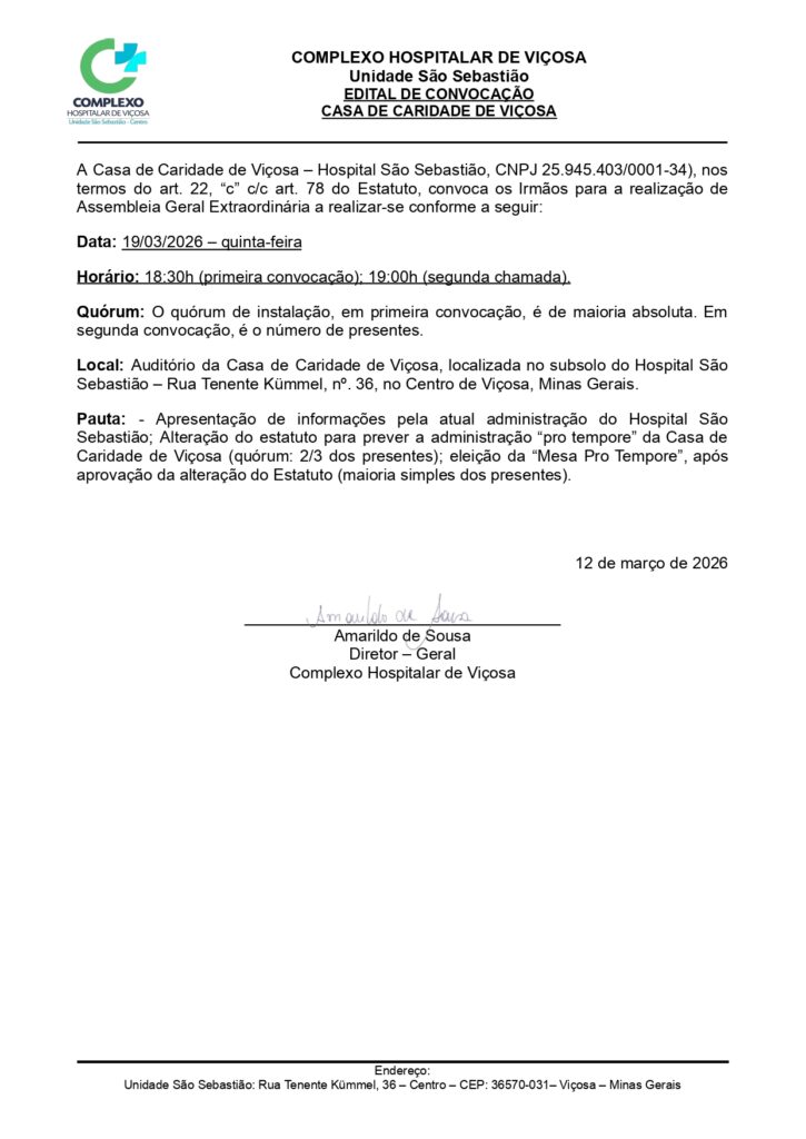 A Casa de Caridade de Viçosa – Hospital São Sebastião (CNPJ 25.945.403/0001-34), nos termos do art. 22, alínea “c”, combinado com o art. 78 do Estatuto, convoca os Irmãos para participarem da Assembleia Geral Extraordinária.